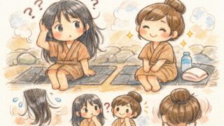初めての岩盤浴で「髪は下ろしたままでもいいのかな?」と迷ってしまいますよね。実は髪を結ぶことは、マナーだけでなく自分の髪を守ることにも繋がるんですよ。仰向けに寝ても邪魔にならない結び位置や、すっぴんを隠せるタオルの巻き方をわかりやすくお話ししますね。