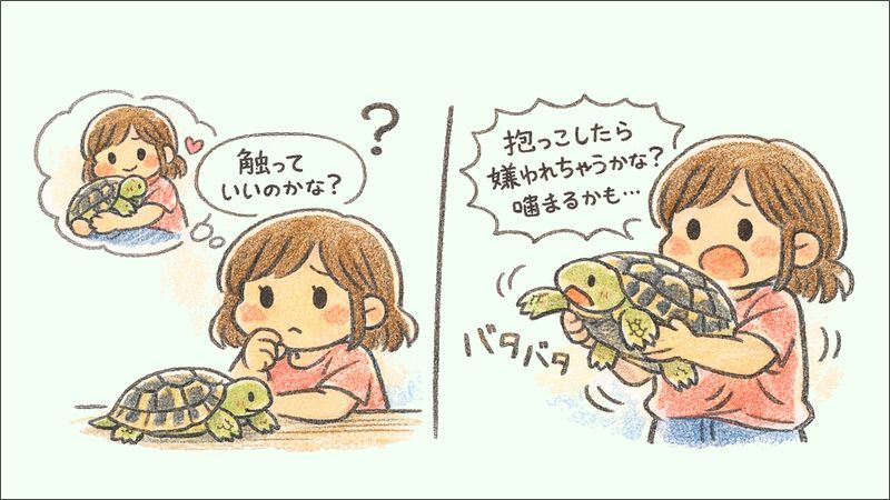 特に、甲羅の上側をつかんで持ち上げるやり方は嫌がる子がいるという話もあります。