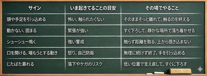 この表みたいに、合図を見たら即対応できるようにしておくと、「結局どうしたらいいの」って迷いが減りますよ。