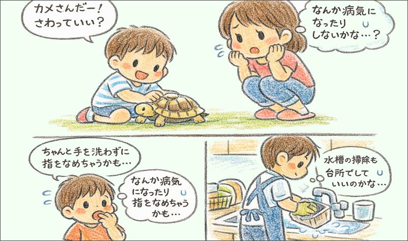 子どもがリクガメに触っても大丈夫か不安なときは、「触った手が口に入る」「掃除や水換えで生活動線に混ざる」というルートを潰していくのがいちばん現実的です。
