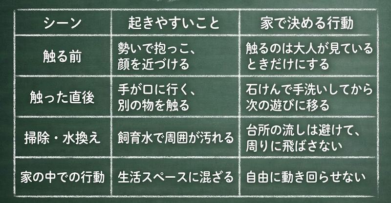 石けんでの手洗い、台所と飼育作業の切り離し、自由に動き回らせない、この3つを家のルールにしておくと、安心感がちゃんと上がりますよ。