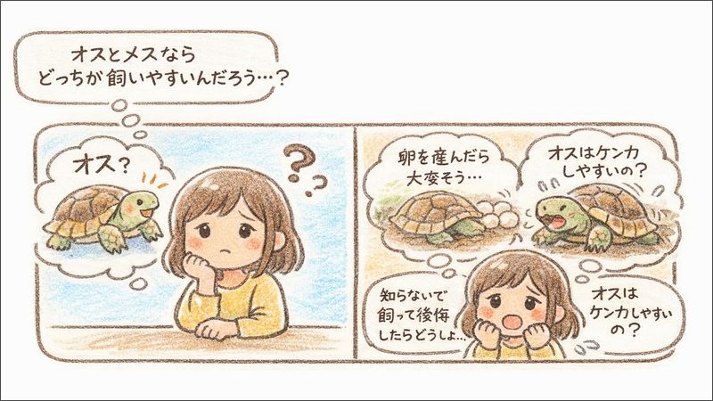 リクガメを飼いたい気持ちはあるのに「オスとメスで性格が違うのかな」「どっちが飼いやすいんだろう」と考え出すと、急に不安が増えますよね。