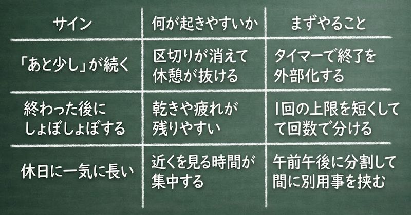 休日にまとめて長くなるなら、午前と午後に分けて、間に外の用事や食事を挟むだけでも、近くを見る時間を分散できます。