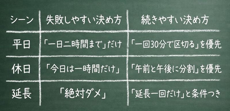 ルールが細かすぎると挫折して、結局長時間になる