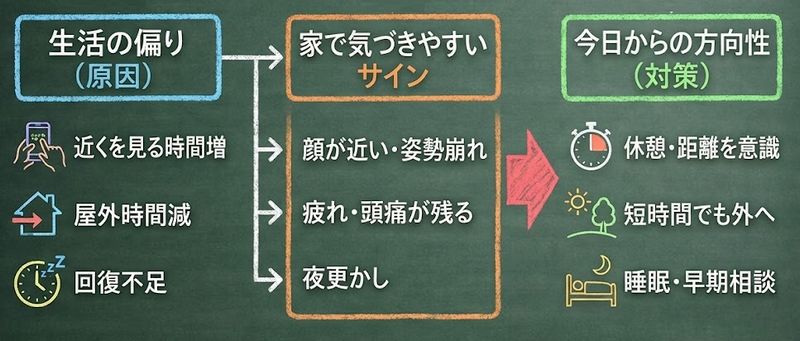 「暗いかどうか」よりも、日常で近くを見る時間が偏っていないかが、まずのチェックポイントになります。