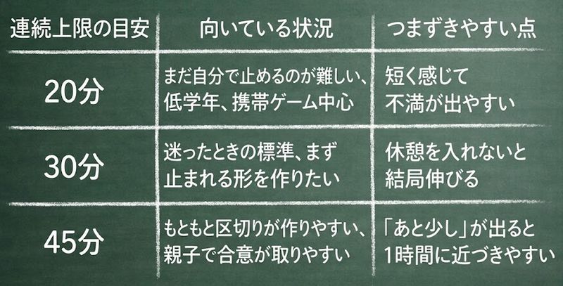 ゲーム時間の上限で迷ったときは、1日の合計よりも「連続でどれだけ続けないか」を先に決めるのがコツです。