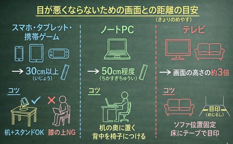 迷ったら、腕を伸ばしても画面に手が届かない距離から始めると、子どもでも守りやすくなります。