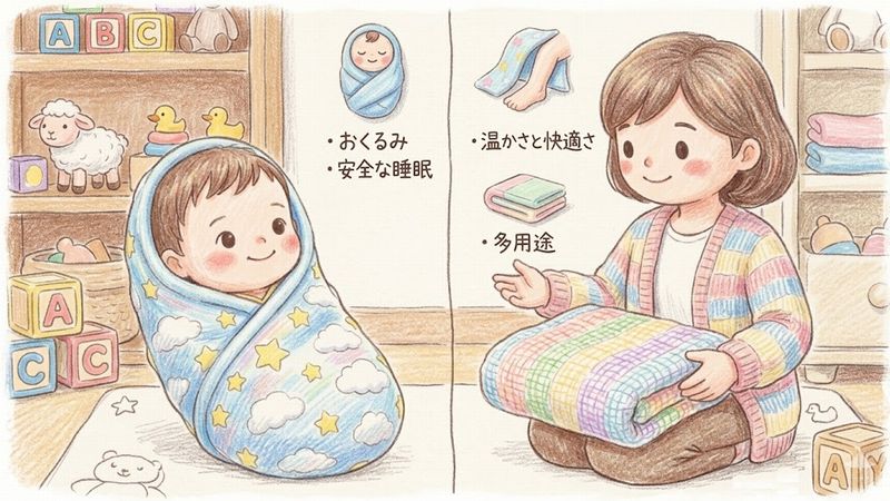 この記事では、おくるみとブランケットの違いを3つの視点でわかりやすく整理しながら、どんな場面でどちらを使えばいいかをお伝えします。
