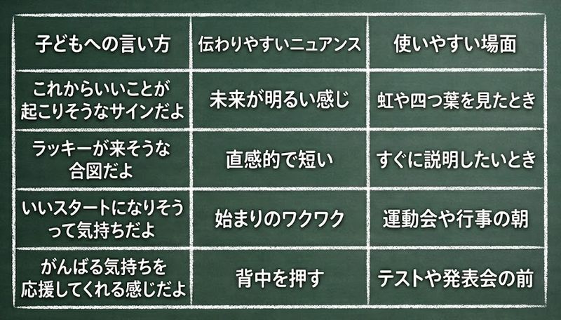 「今日はいいスタートになりそうだね。こういうとき、縁起がいいねって言うんだよ」と結び付けると分かりやすいです。