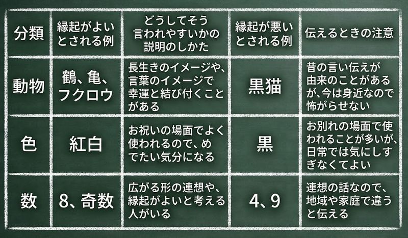 縁起がよいものと悪いものの違いを子ども向けに整理する