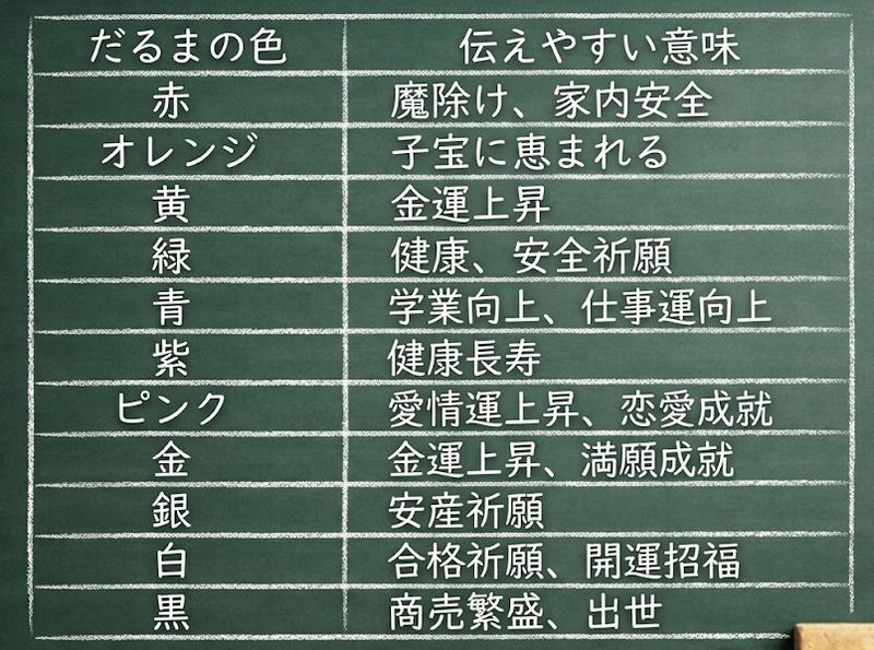 だるまは色で意味が違うと言われることもあるので、選ぶ楽しさにもつながります。
