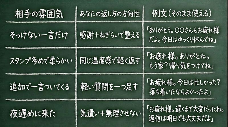 返信の基本は「ありがとう+相手もお疲れ様」で整えて、会話を続けたいときだけ、軽い質問を一つ足すのがちょうどいいです。